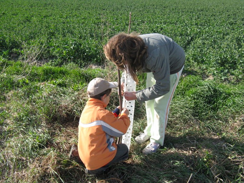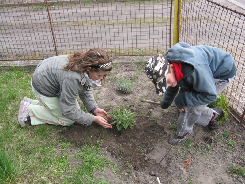 Děti ze zahradnického kroužku vysázely v dubnu podél polní cesty ve skále ořešáky a třešně, na zahrádku ke křížku levandule a šalvěje.