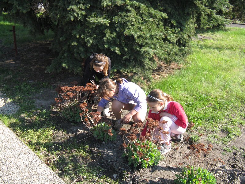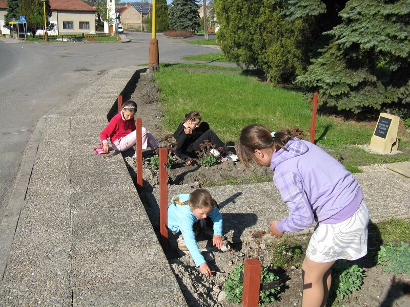 Děti ze zahradnického kroužku pomáhají s úpravou parků v obci.